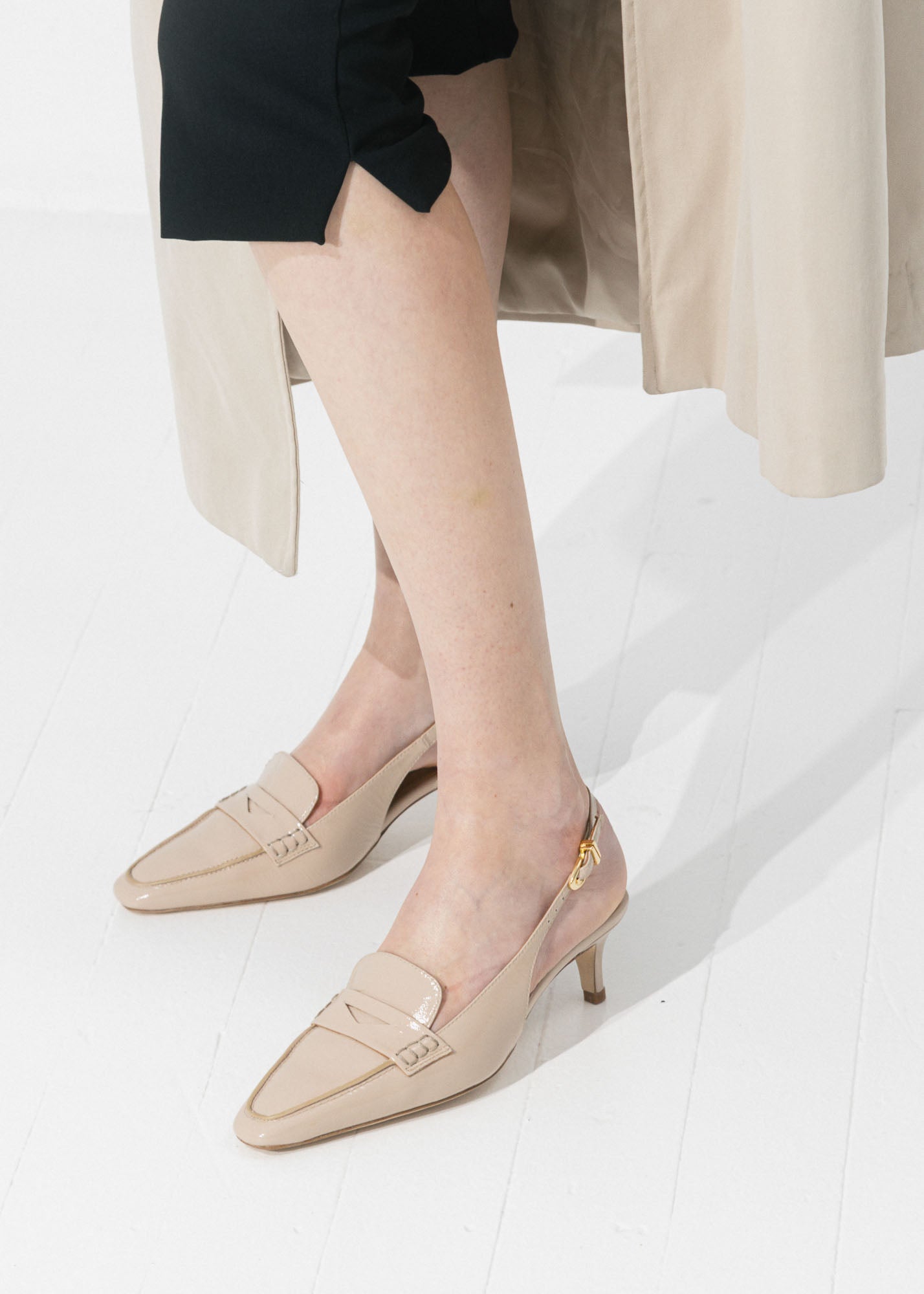 The contrast between the classic front and the slingback design creates a modern balance of strength and femininity.