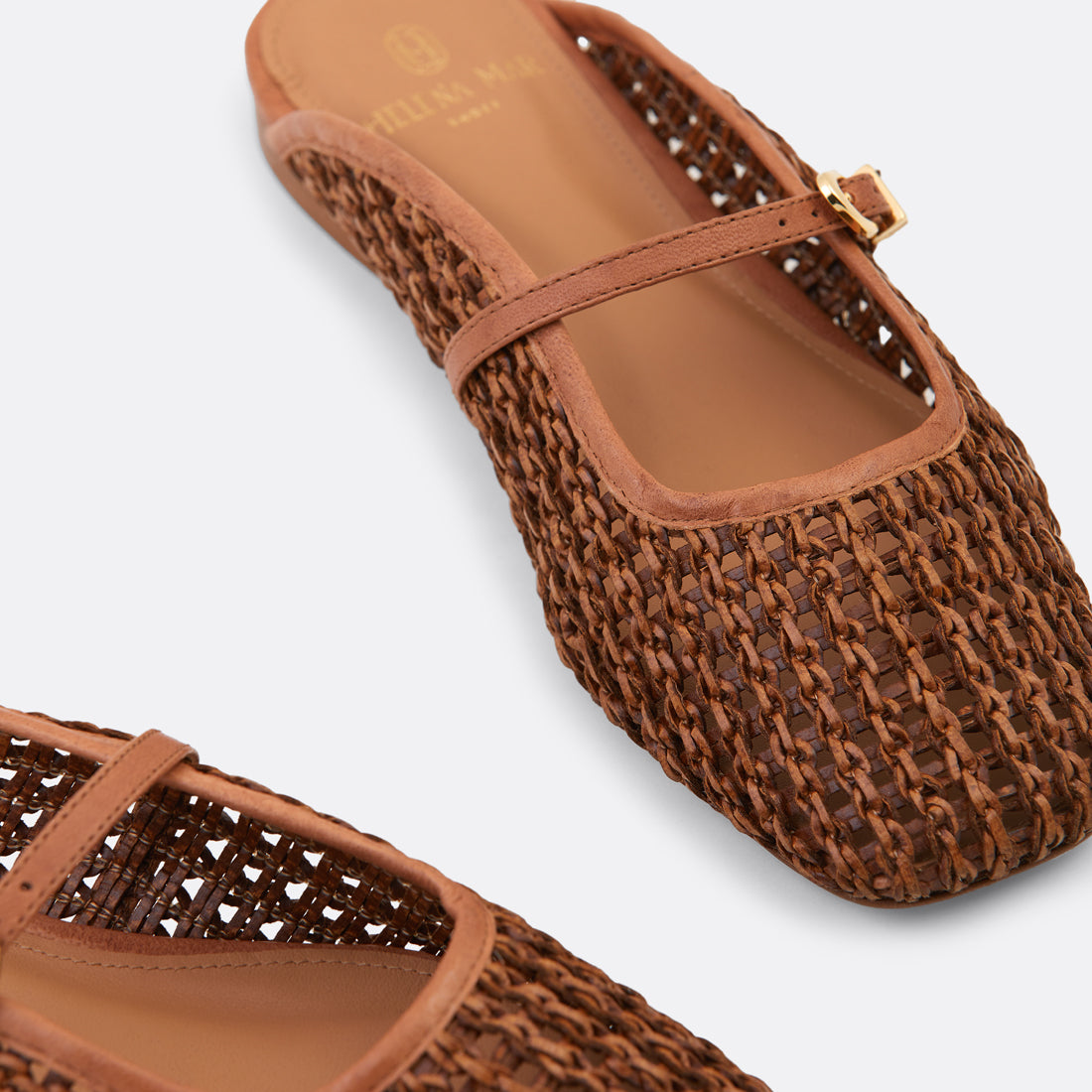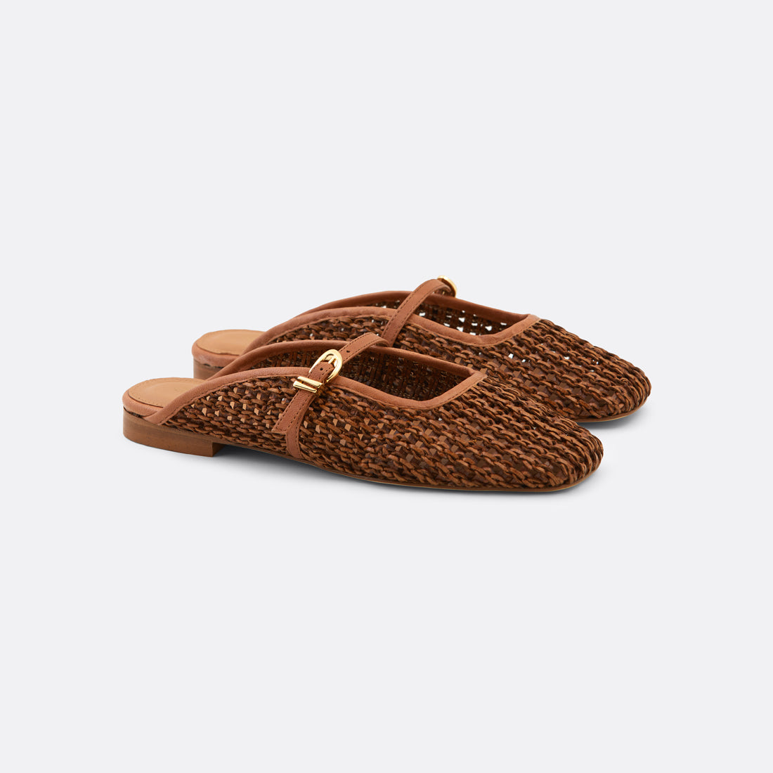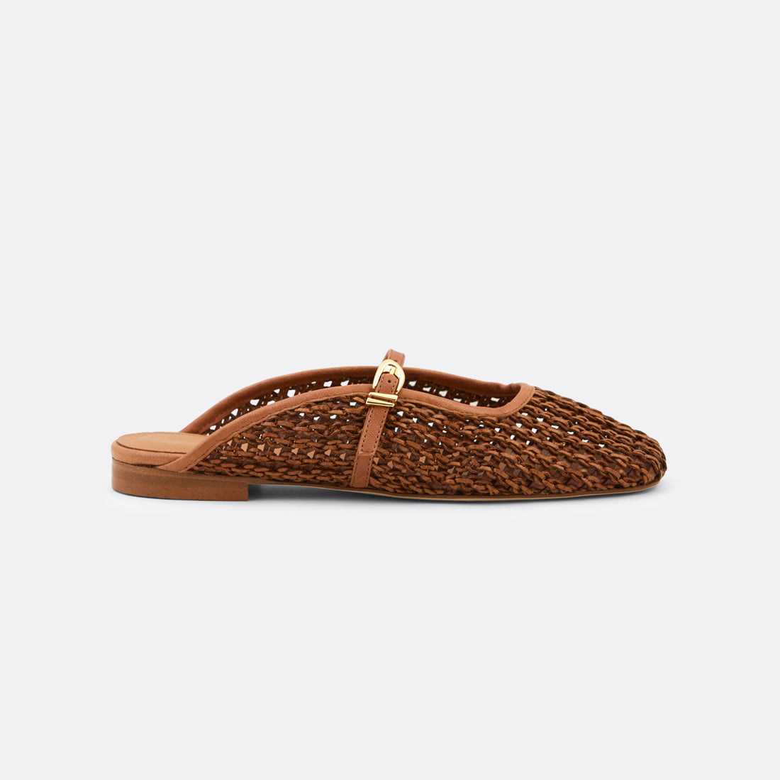 Natural and refined, Solara in raffia blends texture and elegance in a timeless flat silhouette. The woven upper is paired with a delicate leather strap and gold-tone buckle, creating a subtle feminine detail.