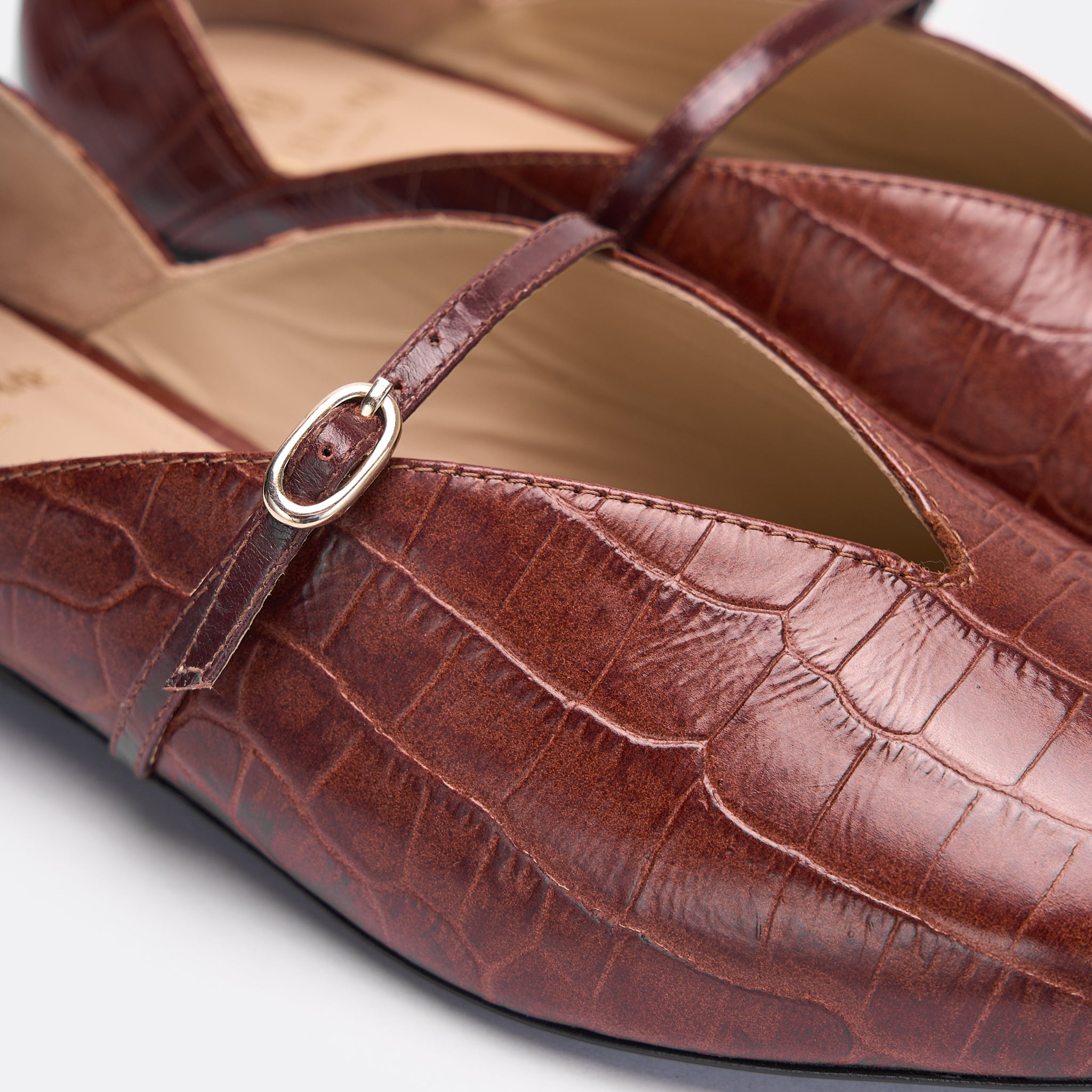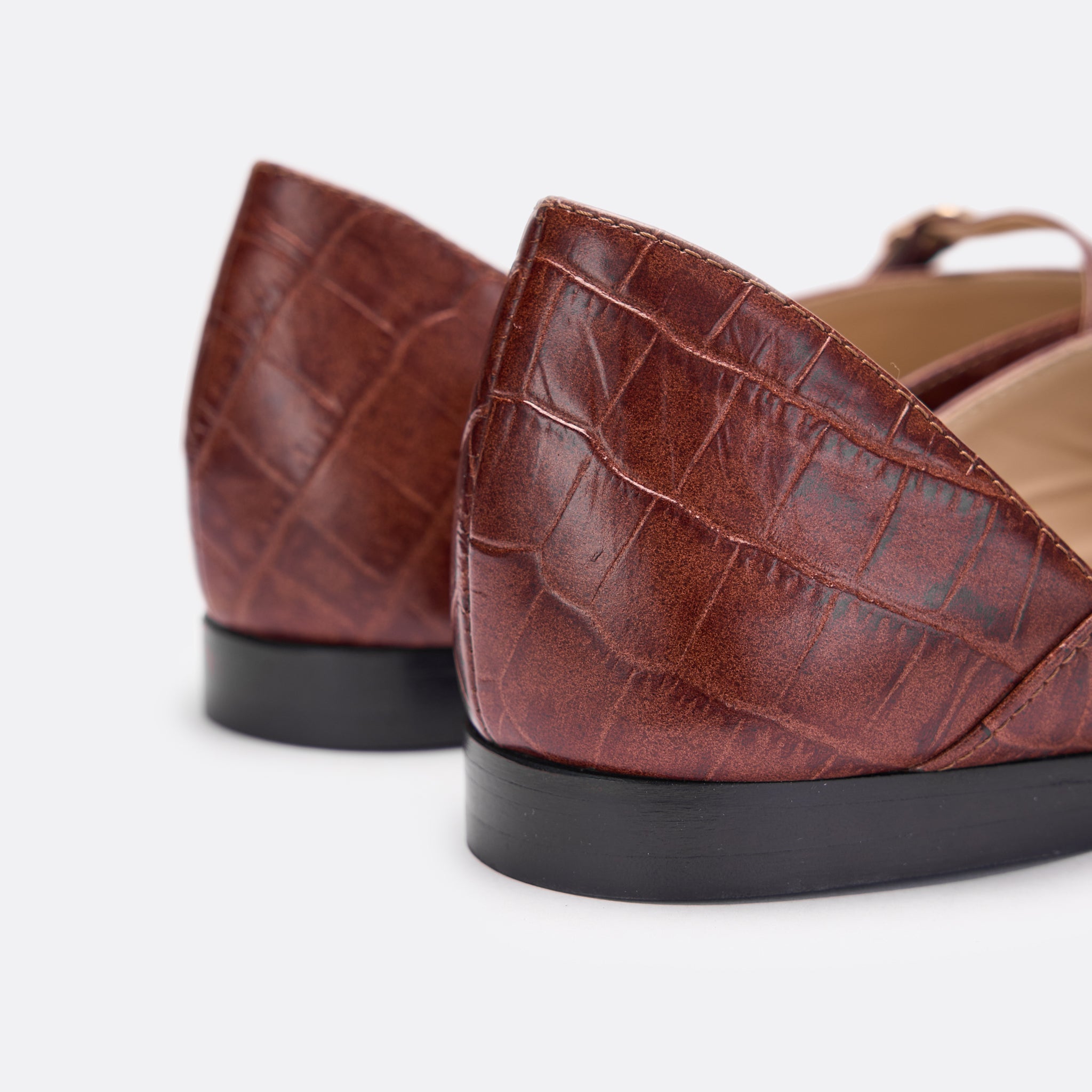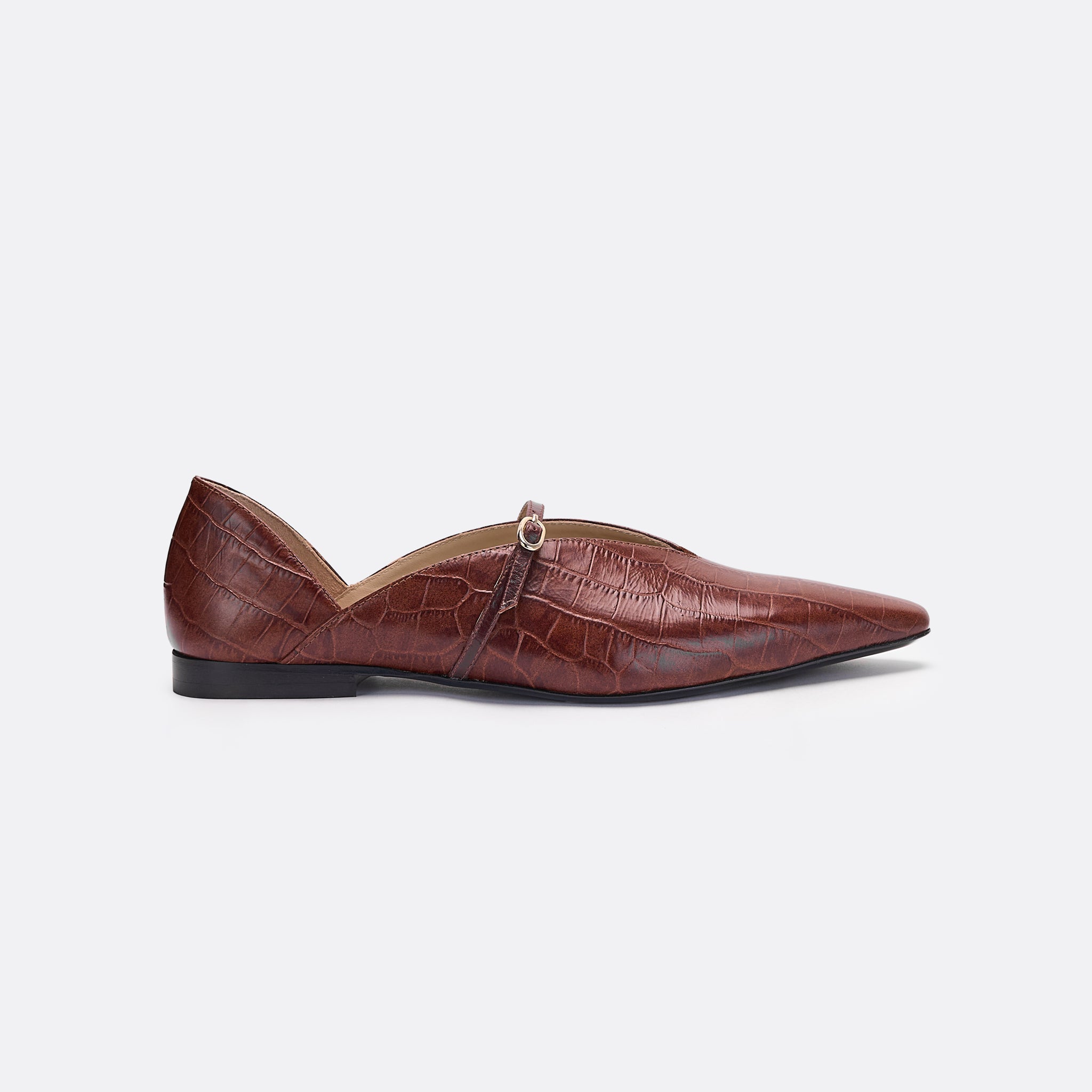 Divine takes on a new texture in rich brown croc-embossed leather. The classic ballet flat silhouette is refined with a slender strap, adding polish to its versatile shape. A perfect blend of timeless style and subtle statement, it’s the pair that carries you from day to night with ease.