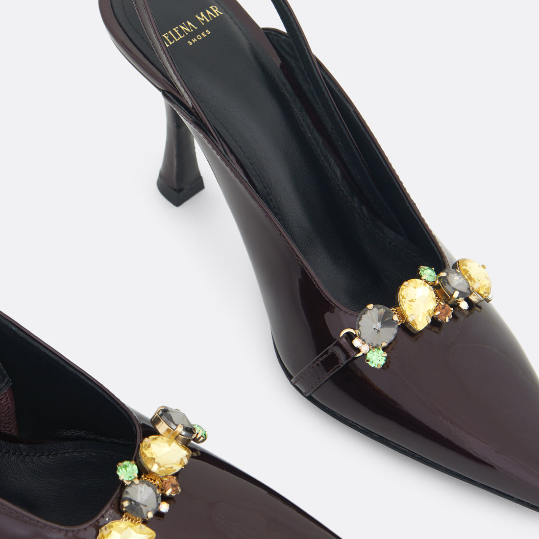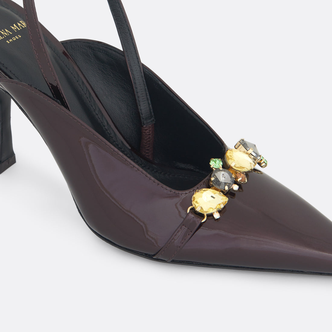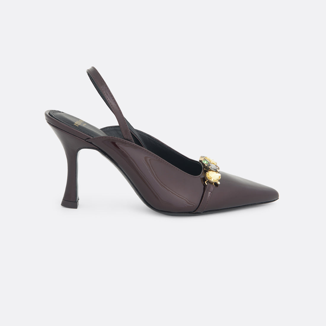 Celestine in bordeaux turns every step into a statement: crafted in deep bordeaux patent leather and finished with brass and crystal details that bring just the right amount of shine. With its 75 mm heel and soft leather lining, it’s bold, feminine, and unapologetically chic.