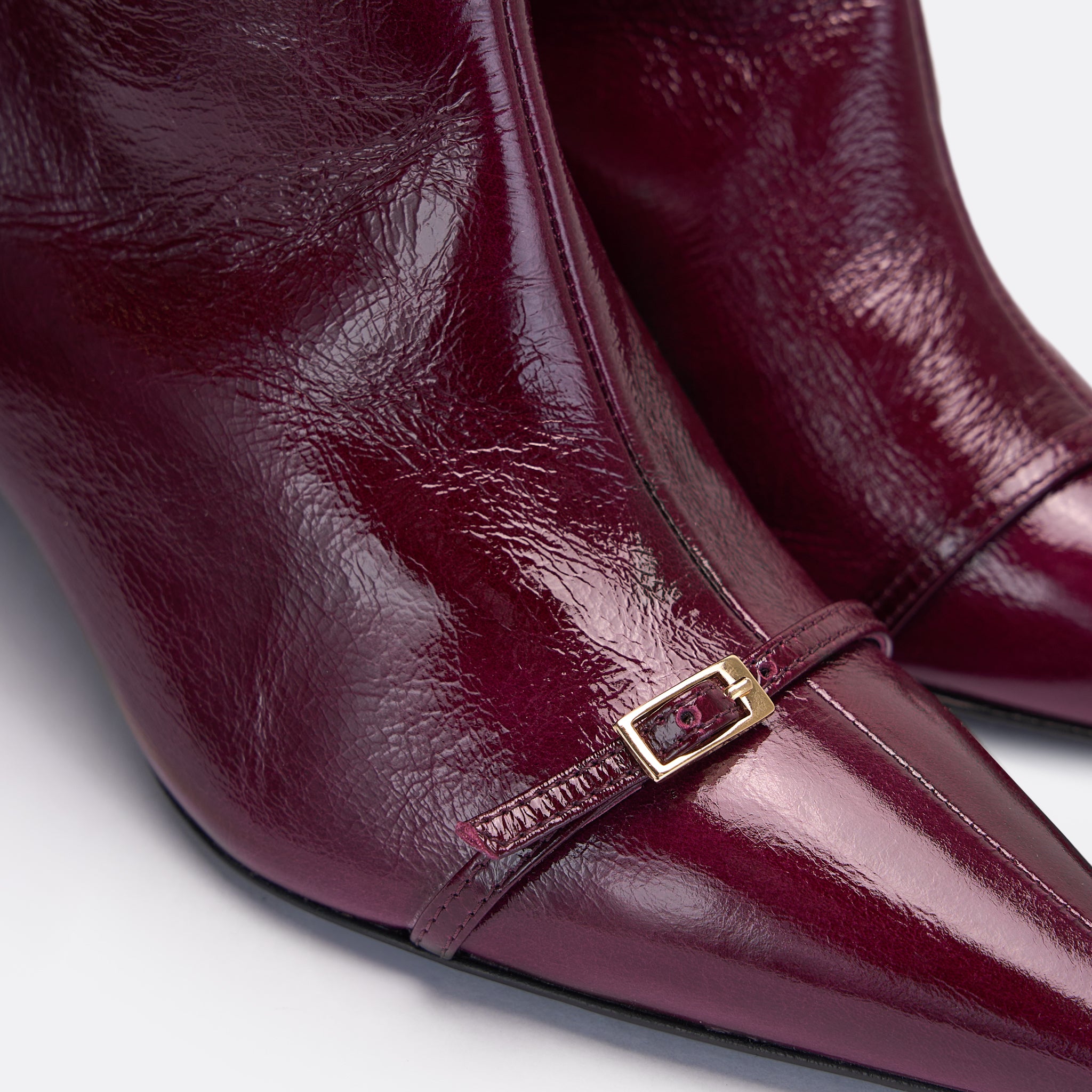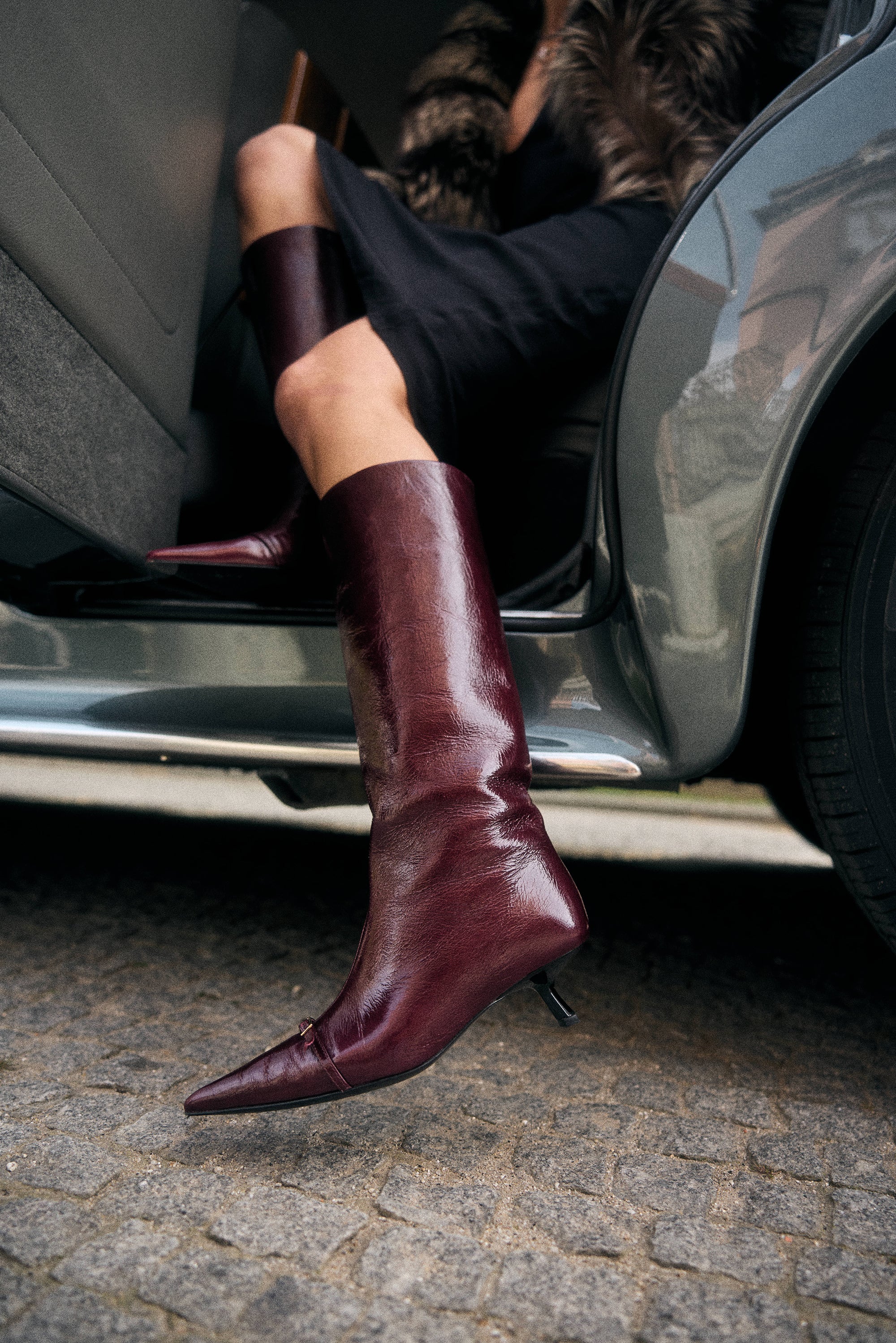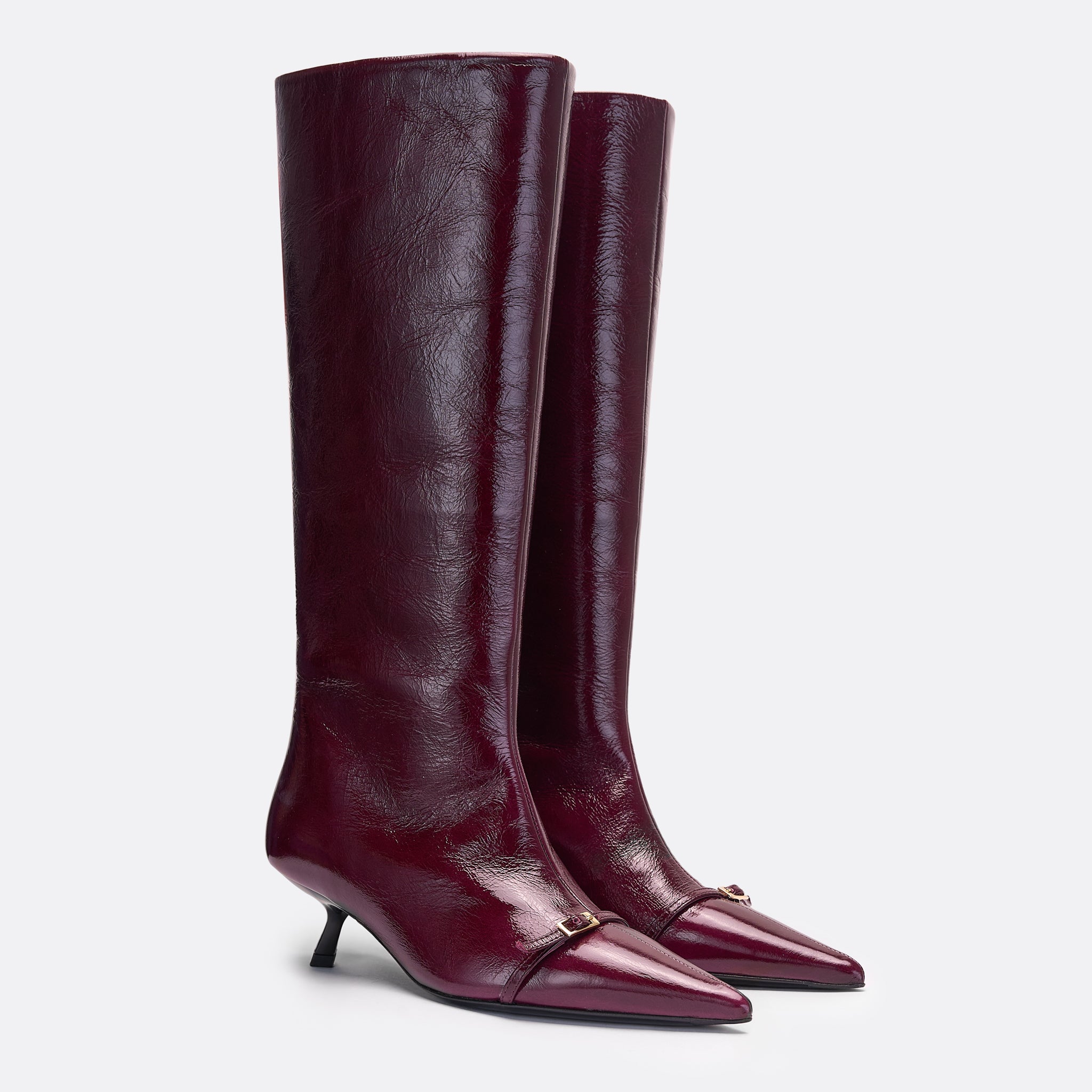 Make a regal statement with Imperial in rich bordeaux leather. This high-calf boot with a bold strap detail and a comfortable 4 cm heel combines elegance and edge: perfect for elevating your fall and winter wardrobe with a splash of color.